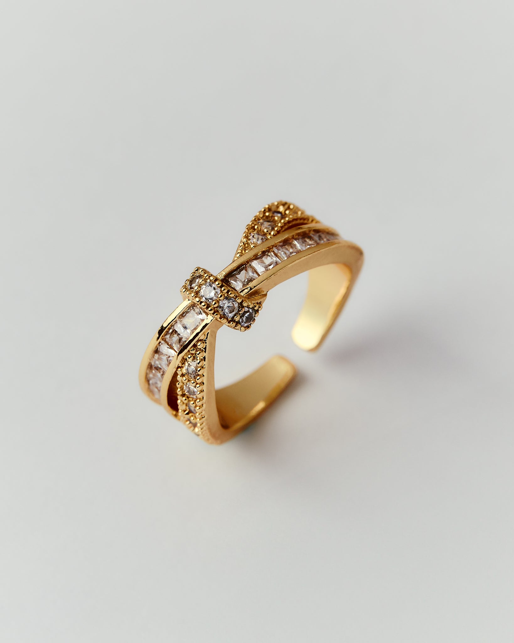 繊細にカットされたストーンが、交差するラインの上で美しく輝くゴールドリング。
