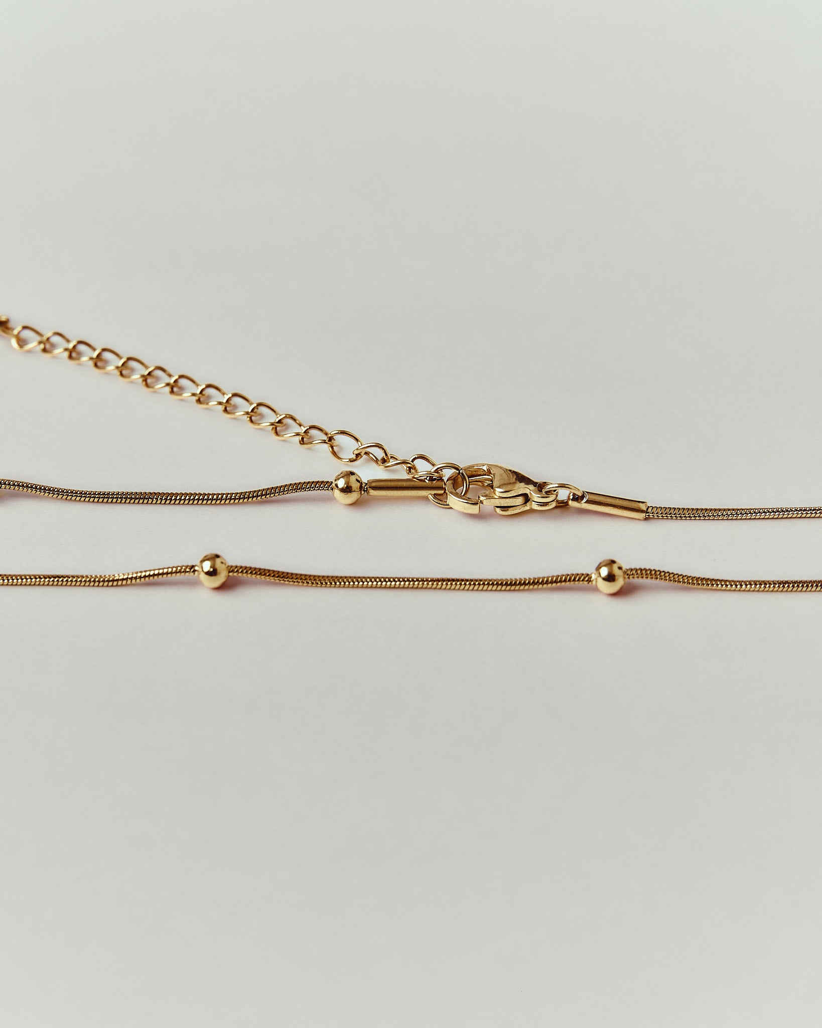 繊細なゴールドチェーンに、小さなビーズがリズミカルに連なるデザイン。